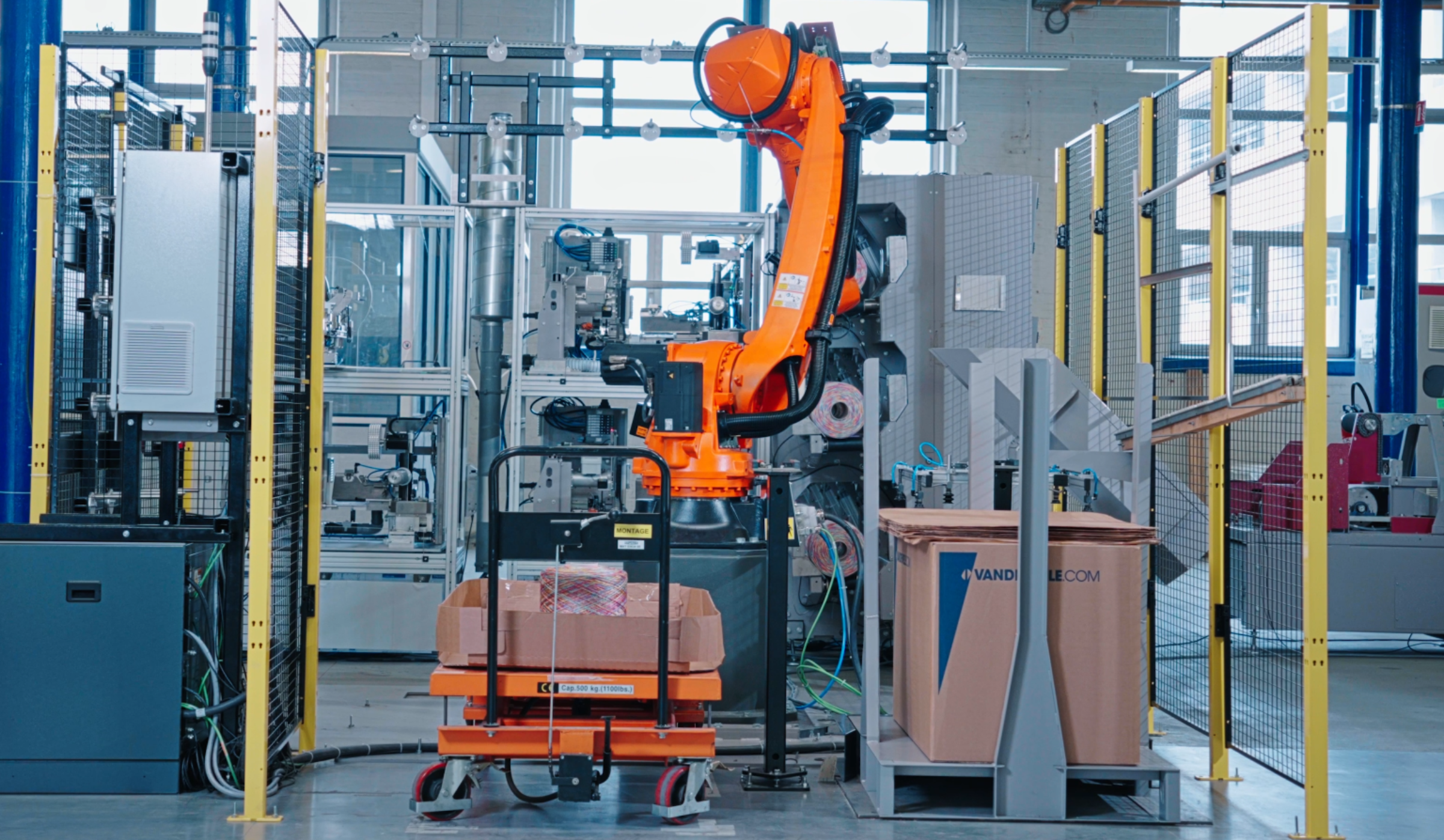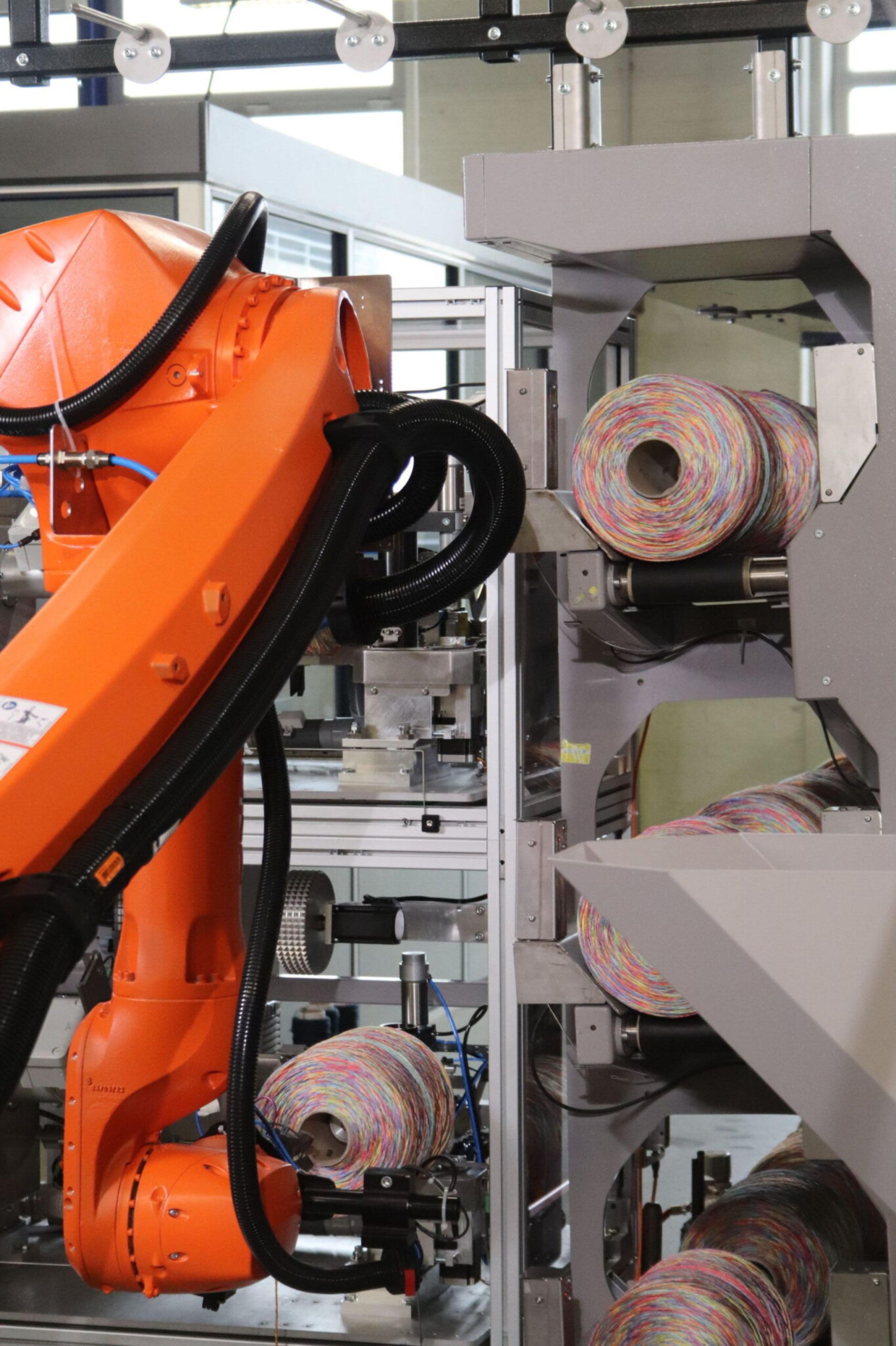 KR1 PRESENTATION VIDEOThe KR1 is an advanced robotic knotting system designed to automate yarn preparation, bobbin transfer, and package handling. It combines industrial robotics, precise control, and modular extensions to create a continuous and reliable workflow.